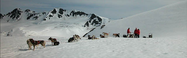 On the glacier, wait to share an essential part of Alaskan culture... Alaska dog mushing! Experienced guides explain unique personal accounts of their own backcountry experiences. As they answer your questions you feel the excitement as the team is hooked up, then... you're off! Imagine yourself standing on the runners of a dog sled with a team of huskies loping across the ancient snowfield nestled among the peaks of the Chugach range. The lure of the trail and thrill of driving a dog team creates the ultimate Alaskan vacation!