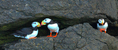 2) Sea Kayak Tour: This paddle is one of the Kayak Guides favorite half day paddles. The water taxi takes you to the eastern remote side of Resurrection Bay and lands in Humpy Cove. There, you will paddle around Orca Island area, and into magical rock gardens teaming with marine wildlife in them... lots of starfish... and other wildlife too! Kayakers will paddle to a salmon stream area, where there is a beautiful waterfall area cascading down pillow basalt formations that are absolutely gorgeous.... Starfish are everywhere... this calm cove is a beautiful emerald green and commonly seen here are sea lions, sea otters, mountain goats, and sometimes orca and humpback whales. Bald Eagles are common. From Orca Island and Humpy Cove we travel south to Kayaker's Cove, where we wait in a comfortable wilderness lodge/hostel for the water taxi to take us back to beautiful Lowell Point. This paddle is appropriate for any athletic ability. No experience is required.